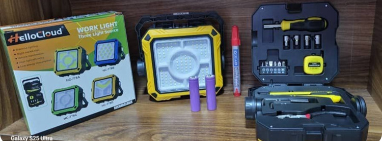 پرژکتور سولار با جعبه ابزار .دارای پنج حالت نور .دو عدد باتری لیتیومی قابل تعویض .ورودی تایپ سی و خروجی یو اس بی.دارای چندین ابزار از جمله دم باریک .آچار الن .پیچ گوشتی.سر بکس.دسته تیغ و متر